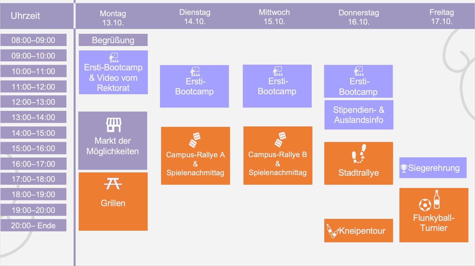 anbei findet ihr unseren Plan für die Ersti-Woche. Dieser Plan gilt sowohl für Bachelor- als auch für Master-Erstis (also alle, die ein neues Psychologie-Studium an der RUB anfangen; unabhängig vom offiziellen Fachsemester, vom vorherigen Studiengang und davon, ob ihr vorher schon an der RUB studiert habt oder nicht). Die Ersti-Woche ist ein Angebot des Fachschaftsrates Psychologie und ist NICHT VERPFLICHTEND; falls ihr also bei der ein oder anderen Veranstaltung nicht dabei sein könnt, ist das nicht schlimm. Meldet euch vorher aber bitte bei euren Tutor:innen (die Gruppen werden am Montag zugeteilt) ab, damit sie das mit einplanen können. Die PowerPoint-Präsentation mit den wichtigsten Infos wird euch von euren Tutor:innen später zwar zur Verfügung gestellt, dennoch raten wir euch, an der Ersti-Woche teilzunehmen, da eines der wichtigsten Ziele der Ersti-Woche das Kennenlernen untereinander und das Knüpfen von neuen Kontakten ist. Außerdem garantieren wir euch eine Menge Spaß!